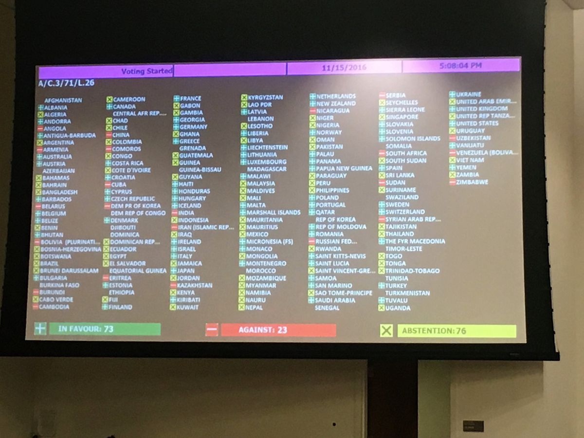 73 states voted in support of the document, 23 voted against, and 76 abstained. 41 states joined the list of co-sponsors.