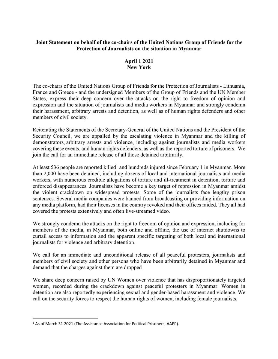 The co-chairs of the United Nations Group of Friends for the Protection of Journalists - Lithuania, France and Greece - and the undersigned Members of the Group of Friends and the UN Member States, express their deep concern over the attacks on the right to freedom of opinion and expression and the situation of journalists and media workers in Myanmar and strongly condemn their harassment, arbitrary arrests and detention, as well as of human rights defenders and other members of civil society.