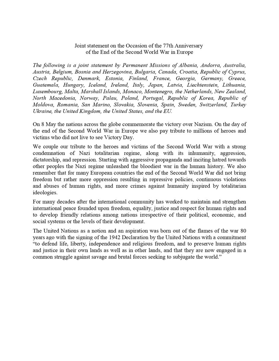 Against this backdrop we witness cynical attempts to appropriate and exploit the memory of the victory over Nazism and to use it for justifying this full-scale invasion of Ukraine. We strongly reject Russia´s continued efforts to distort history for its own political purposes to promote a false narrative and disinformation on neighboring countries, including by inciting hatred by labeling others as “neo-fascists” and “neo-Nazis.”