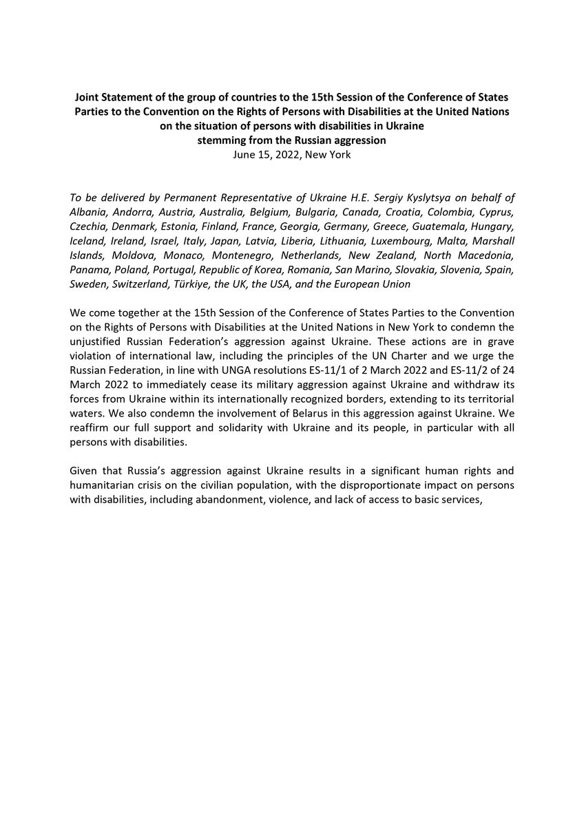 We come together at the 15th Session of the Conference of States Parties to the Convention on the Rights of Persons with Disabilities at the United Nations in New York to condemn the unjustified Russian Federation’s aggression against Ukraine. These actions are in grave violation of international law, including the principles of the UN Charter and we urge the Russian Federation, in line with UNGA resolutions ES-11/1 of 2 March 2022 and ES-11/2 of 24 March 2022 to immediately cease its military aggression against Ukraine and withdraw its forces from Ukraine within its internationally recognized borders, extending to its territorial waters. We also condemn the involvement of Belarus in this aggression against Ukraine. We reaffirm our full support and solidarity with Ukraine and its people, in particular with all persons with disabilities.