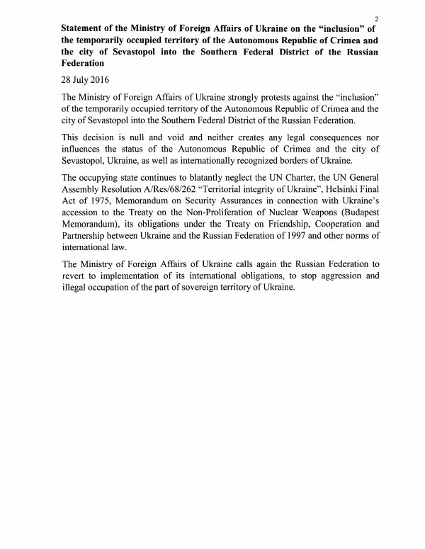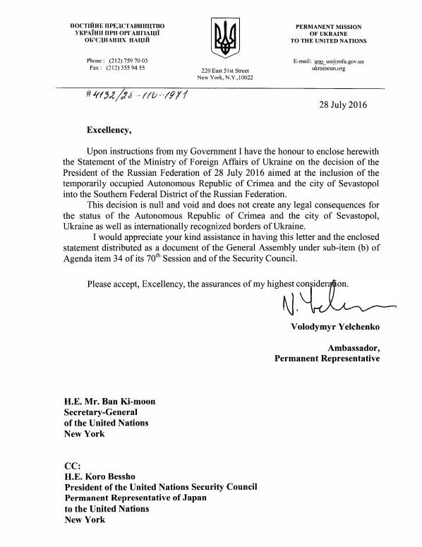 Letter from Ambassador Volodymyr Yelchenko to UN Secretary-General and UN Security Council President on Russian president's null and void decision on Crimea July 29, 2016