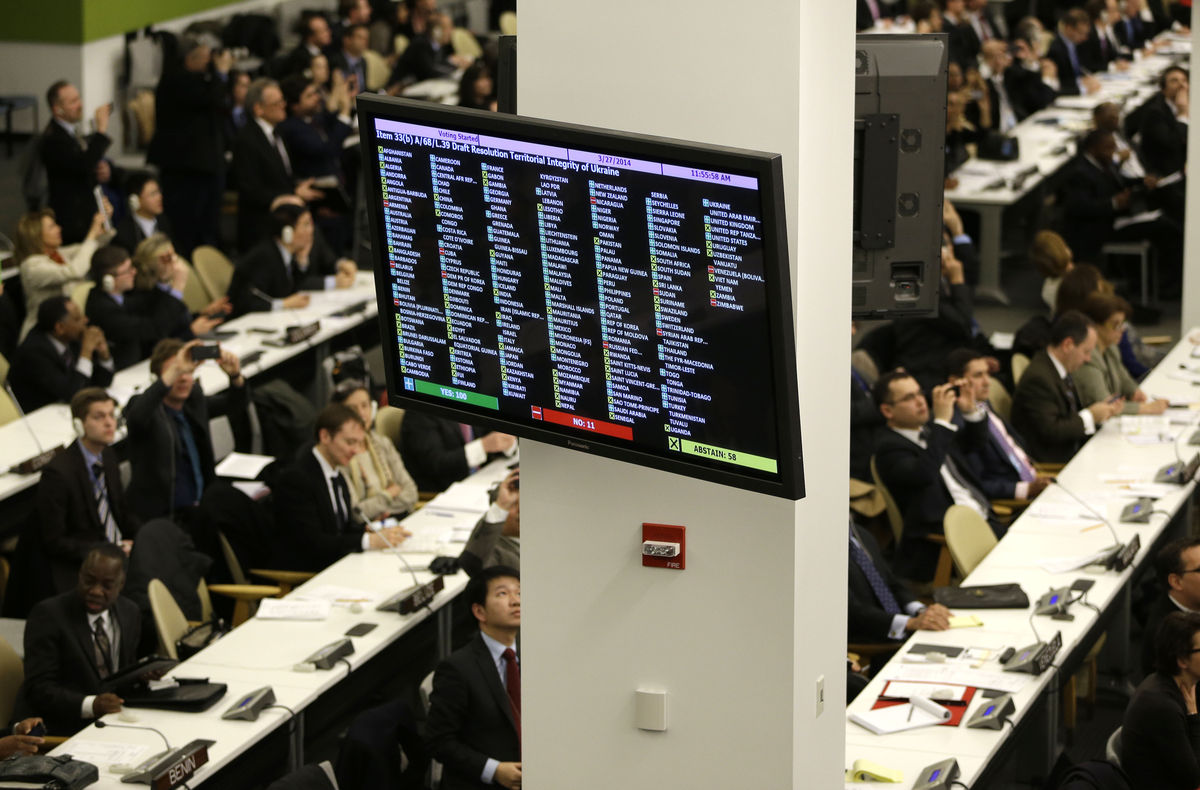 On March 27, 2014 the United Nations General Assembly by an overwhelming majority, with 100 votes in favour to 11 against (including Russia), adopted the resolution “Territorial integrity of Ukraine”, thus confirming Ukraine’s sovereignty, political independence, unity and territorial integrity within its internationally recognized borders.